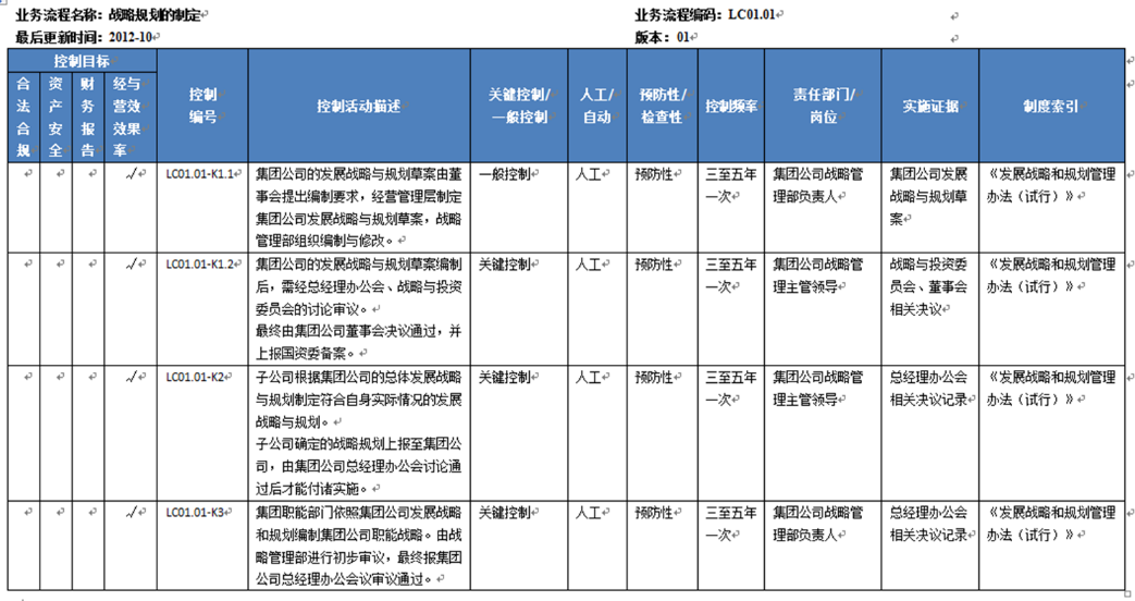 2、按照企事业单位所应遵循的内控要求(上市公司内控指引、国资68号文等)开展管理要素与活动的梳理,编制内控体系文件,包括流程图、风险控制矩阵以及相应制度文件的修改,形成《内部控制手册》