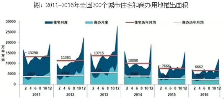 1、全国各类土地供需量仍保持低位。在全国去库存政策的指导下,地方政府继续减少土地推出量,2016年全国300个城市共推出各类用地18.2亿平方米,同比下降11.0%,降幅较2015年收窄7.8个百分点,整体仍处于较低水平。