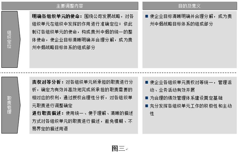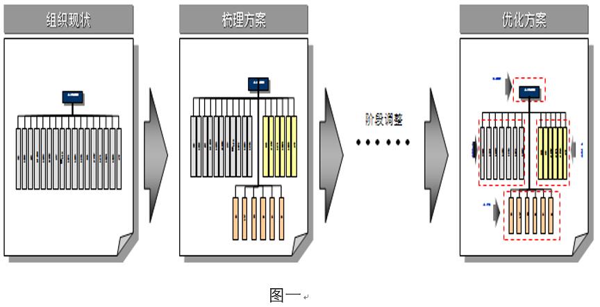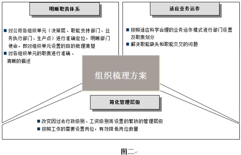 组织结构梳理方案的设计是在现行组织结构不变的情况下从三项关键内容着手:明晰职责体系、适应业务运作、简化管理层级。