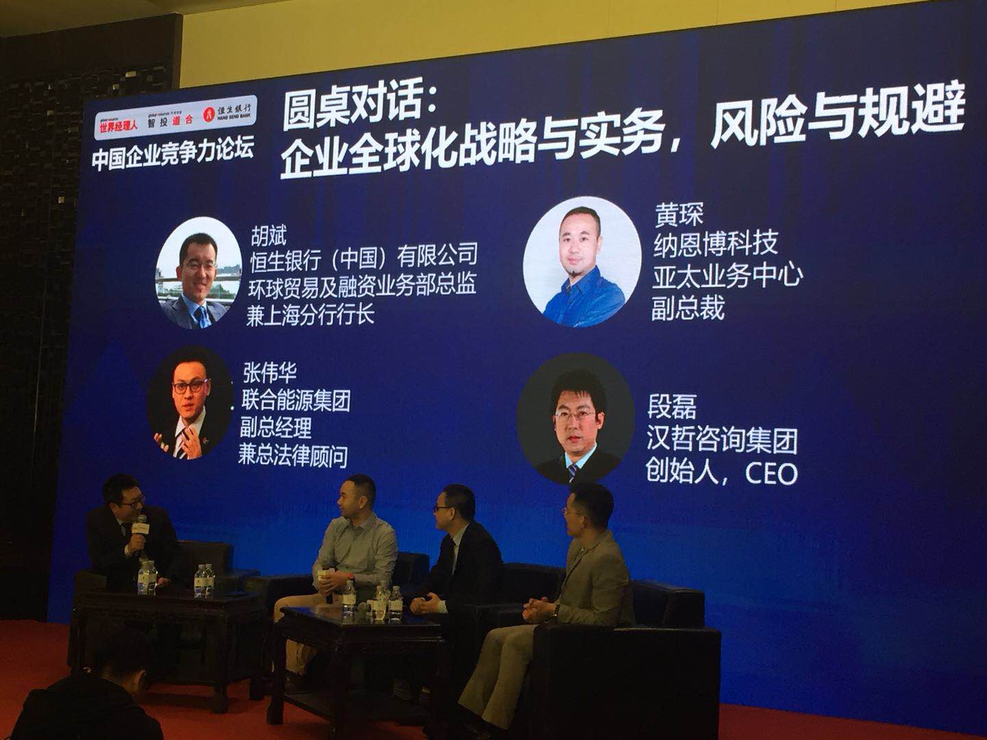 同时,段磊博士还应邀主持了本次论坛的圆桌对话,与恒生银行环球贸易与融资业务部胡斌总监、联合能源副总经理张伟华先生、纳恩博科技亚太业务中心副总裁黄琛先生同台,深入探讨了中国民企全球化的机遇与挑战,企业在全球化过程中的内部变革,以及面向当前形势的全球化路径与风险控制,现场观众也与嘉宾踊跃互动,进行了深入的研究与探讨。