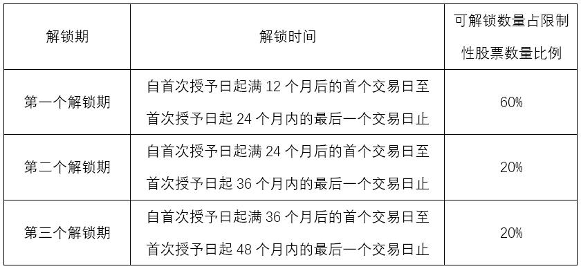 4、解锁日:限制性股票激励计划的有效期为自限制性股票首次授予日起不超过五年。锁定期内激励对象因获授的限制性股票而取得的红股、资本公积转增股份、配股股份、增发中向原股东配售的股份同时锁定,不得在二级市场出售或以其他方式转让,该部分股票的锁定期与获授的限制性股票锁定期相同。解锁期在首次授予日起满12个月月后的未来36个月内分三期解锁(如表2-2所示)。