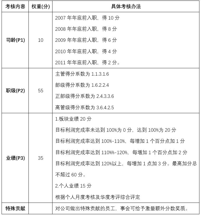 以激励对象的司龄、职级、业绩三个因素作为考核得分的依据,计算出各对象的考核得分。具体考核权重因素如表3-5所示: