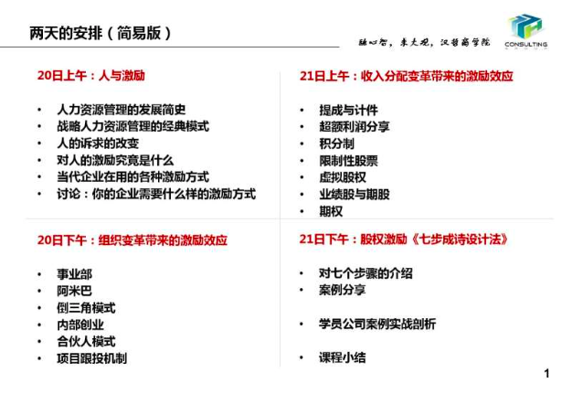 两天的学习,让学员对于创新激励有了全面的了解,掌握了包括组织激励在内一系列激励方式和方法,也更加深刻地理解了股权激励的意义、作用和适用范围,正本清源,为学员用好、用对这一管理工具打下了良好的基础。