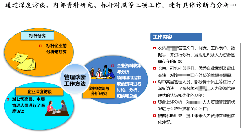 项目组通过内部资料研究、企业深度访谈、外部标杆对比等方式对公司管理现状进行全面诊断,发现问题并提出改进的思路。