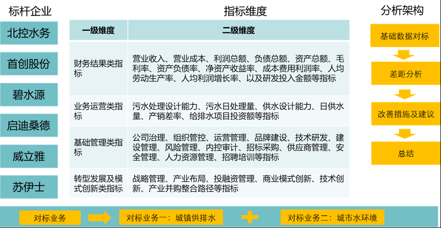 为实现客户对标需求,项目组结合客户在水务行业的战略规划,在与客户进行充分沟通的基础上,明确了对标企业范围、标杆企业选取原则和对标业务类型。在此基础上,从多维度、立体化的系统性思维角度出发,设置一级指标维度以及相应的二级指标维度,形成对标指标框架。最后,搜集相关数据,结合对标分析架构,分别对各维度进行细化分析。