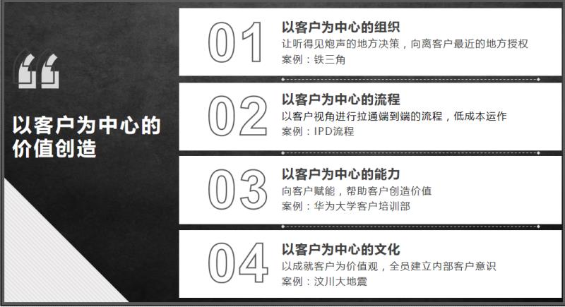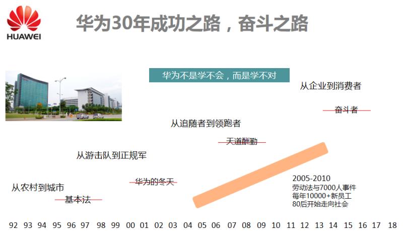 在“成功之路”部分,苏老师分享了华为在30年间从农村到城市、从游击队到正规军、从跟随者到领跑者、从企业到消费者的四次转型,尤其是华为管理实践中的“两个主义”,给大家留下了深刻的印象。