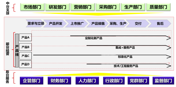 组织运作机制可以整体概括为:前台经营、中台支撑、后台服务。流程体系设计需要以组织架构为基础和前提,因此,项目组将通过行业最佳实践、能源技术公司组织运作模式分析,与能源技术公司中高层进行充分研讨,进一步明确组织架构及运作模式。项目组初步认为,能源技术公司需要建立以产品线为主线,中台和后台全力支撑产品,从需求立项、开发、上市推广、销售、采购生产、交付、售后的全生命周期组织运作机制,打破部门墙,建立矩阵式柔性组织体系,支撑流程的高效运转。