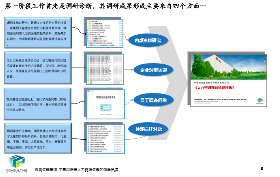 项目原计划第一阶段进行战略澄清,旨在通过调研、对标与管理诊断,发现并剖析组织存在的根本问题,通过对战略的梳理与澄清,明确未来的管理提升日程表,指明方向并明确优先次序。实际实施过程中,客户核心领导认为新能源汽车行业政策的不确定性,公司战略很难明确,因此项目组选择了通过内部资料研究、企业深度访谈、员工调查问卷、外部标杆资料对比,政策研究等维度,对其战略、组织、人力资源管理、组织文化等进行全面诊断,发现问题并提出改进的思路。