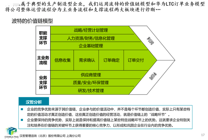 项目组针对公司在生产运营中凸显的问题,应用波特的价值链模型与华为的LTC订单业务模型对公司各项业务活动进行了分析和优化,提出主业务流程框架及业务与支撑流程清单。