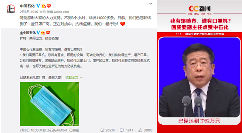 口罩协同生产案例:2月6日下午,中石化在官方微博发布消息称,中石化易派客(中石化旗下电子商务网站)正寻找口罩机,截至2月7日中午,中国石化就已与合作伙伴对接完成11条口罩生产线。据初步估算,到2月29日,实现新增产能至60万片/日,3月10日,实现新增产能至100万片/日以上。与此同时,中国石化也已经联系到3家地方的口罩生产企业,为他们提供熔喷布原料和协调生产设备,其中房山区的1家企业,马上供料就可日产口罩3.5万片。