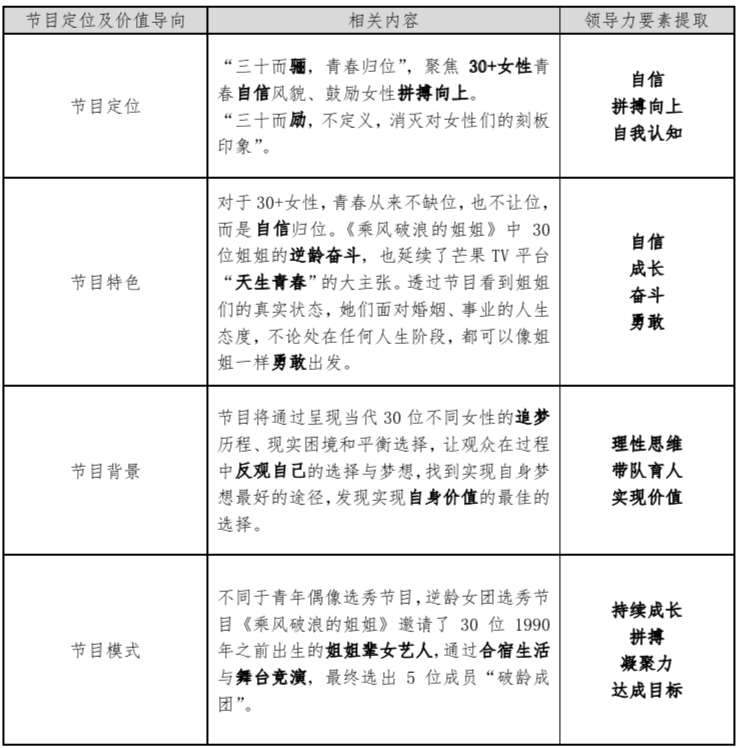 而在此背景下,参加节目的30位“小姐姐”的身上,尤其是每次分组选取的团队leader的身上更应该体现与其价值定位相适应的的领导力要素,从而使其带领的团队能无限放大节目传递的价值观。