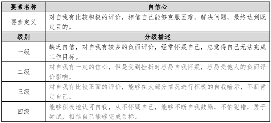 根据上述构建的领导力模型,笔者参考“太阳成集团tyc122cc入口咨询”开发的《HAN-82胜任力模型分类词典》,对此次构建的领导力模型的九个要素分别进行了指标定义及分级标准描述。比如:自信心: