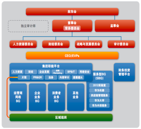关于华为的组织架构的表述,事业部、职能部门,以及事业部与地区公司关系的表述,在华为的基本法中可以找到相关的规定: