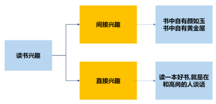 间接兴趣是相对于直接兴趣而言的。简而言之,间接兴趣是对结果的兴趣,直接兴趣是对过程的兴趣。打个比方,爸爸和孩子在海滩边玩泥巴,两个人都很开心。小孩开心,是因为对在泥巴的搓捏和变形过程中感受到的探索和控制的快感。爸爸开心,是因为小孩玩的很开心他也很开心。小孩的这种开心就是纯粹的直接兴趣,爸爸的这种开心就是间接兴趣。同样,如图1所示,同样是喜欢读书,读书的直接兴趣和间接兴趣差异也很大。