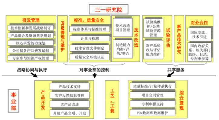 核心模式是事业部和专业公司架构下的“三级营销+两级研发”的方式,这一模式下:一是生产制造职能全部由事业部承担;二是营销为三级管理,总部有营销本部,事业部有营销公司、营销公司下设营销部,同时营销承担市场、服务、销售等综合职能;事业部营销会根据需要分设区域组织进行营销;三是研发分为两级,一级是总部研究院,承担了新技术研究,标准制定,研发、技改、试验评估等前沿性、通用性、探索性等研究任务;二级是事业部研究院,承担了产品工艺改良,以及商务或服务支持等职能。二级管理角色明确,使得研究力量得到了很好的分配和使用。