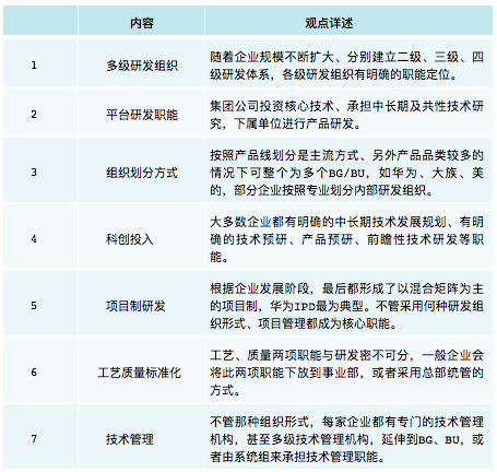 在研究这五家公司的研发组织模式之后,笔者提炼关键要素及共性要素,观点如下。
