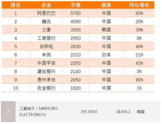 在2019年最新的亚洲最值钱公司的排名中,三星是唯一一家上榜的韩国企业,市值达到了3200亿美元,核计人民币2.13万亿,排名亚洲第三。仅三星集团一家公司就占据了韩国20%的GDP。在2020年《财富》世界500强排行榜中,三星旗下三星电子排名19,其营收1977.046亿美元,利润184.533亿美元。