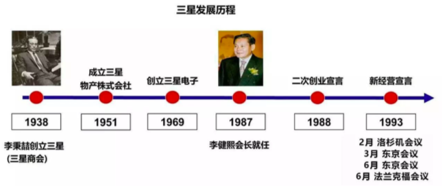 1987年12月,三星集团第二代掌门人李健熙正式接任会长一职。在1988年三星50年庆典上,李健熙宣布集团开始“二次创业”,要把三星发展成为世界一流企业。他强调:如果不能清楚地认识到自己是从哪里来的、比别人落后在什么地方,就无法在这个激烈竞争的时代生存。“二次创业”也是“新经营”变革的前奏。