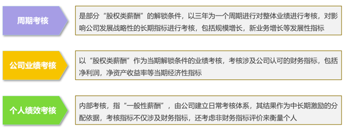约束条件是股权激励的一个重要环节,是公司战略目标实现和整体工作导向,在公司业绩评价过程中完全看财务指标,避免不了产生短期行为和弄虚作假,这里约束条件分为“周期考核”、“公司业绩指标”和“个人绩效指标”三个方面。