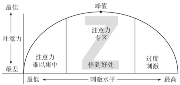 进入心流状态,对所从事的工作的任务类型、任务难度,即刺激水平,有一定的要求,研究者发现,在刺激水平适中的情况注意力的集中最好,如果刺激水平过低,则不足以全部激发注意力,而在刺激水平过度时,则容易导致注意涣散。注意力与刺激水平呈现出倒“U”形的关系。