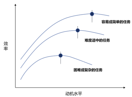 瓦伦达效应很多人熟悉,著名的高空走钢索者瓦伦达演技精彩稳健,在一次重要演出前,反复自我暗示“这次很重要,不能失败”,最后表演时不幸失足。适度的动机可以激发人应对困难时的心理能力,但是动机过强,则可能导致效率和效果反而下降。动机的最佳水平与任务难度相关,任务越简单,最佳动机水平越高,任务越难,最佳动机水平越低,如图2所示。心理学上称这一定律为耶基斯-多德森定律。