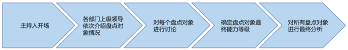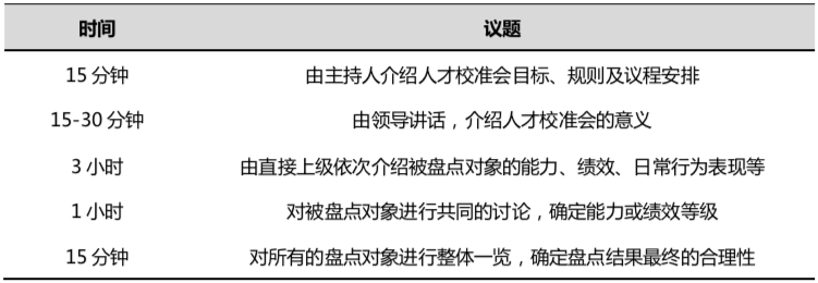 人才校准会的主要流程为由主持人引导这个过程,由直接上级对被盘点队对象进行讨论。