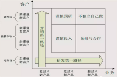很多企业的研发和市场分属于两个独立的部门,研发过多的关注新技术,营销喜欢围绕老客户和老产品工作,结果是:对老客户的需求关注不够,新技术、新产品推出进度不尽如人意。如何在新老产品以及新老客户上配置资源,以便企业的扩张风险最低和投入产出最高,速度最快,就是通常所说的产品开发的扩张路径,从业务和客户两个维度,可以分为以下几类:
