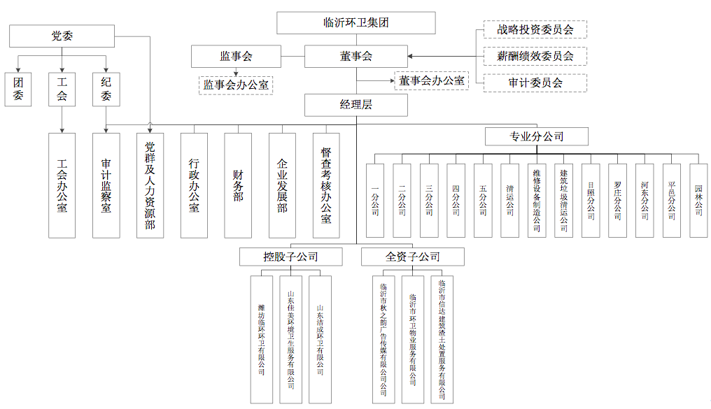 目前,集团总部内设办公室、财务审计部、党群及人力资源部、企业发展部、工会办公室、督察考核办公室、纪检监察室和环卫综合服务中心等8个部室。下设有一分公司、二分公司、三分公司、四分公司、五分公司、罗庄分公司、河东分公司、日照分公司、建筑垃圾清运公司、环卫设备研发制造维修公司等近20个专业分公司。