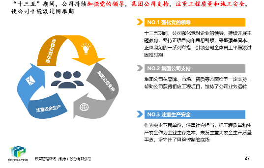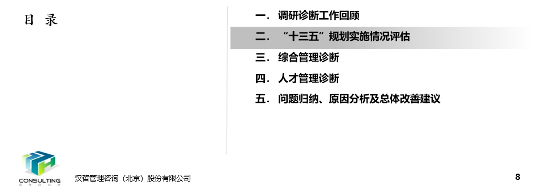 其中,“十三五”规划实施情况评估,主要是针对客户“十三五”规划整体目标,分别进行评价,分析目标达成或未达成原因,以及结合当前内外部环境,提出未来发展方向建议。