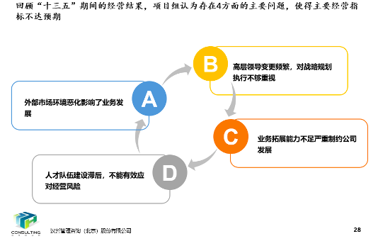 在十三五期间,由于公司核心领导班子成员不断调整,同时受天津建筑市场整体环境影响,业绩波动很大,很多业绩指标不达十三五规划目标。在此背景下,公司拟聘请一家咨询机构,协助其对十三五规划执行情况进行评估,并对公司管理进行全面综合诊断,指出未来发展的方向与重点举措,同时提出配套的人才队伍建设规划。