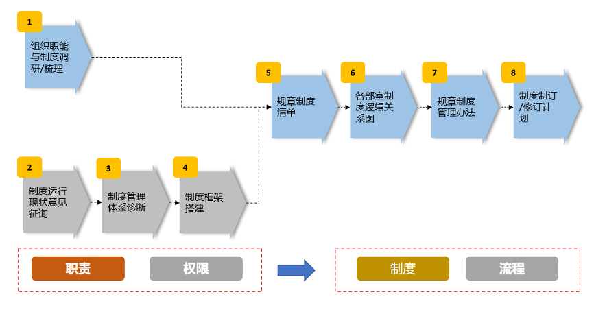 针对当前的现状及项目需求,项目组主要从四个阶段开展工作:首先,对公司总部及所属单位关联部门的组织职能进行自上而下的梳理,确保职能上下贯通,没有交叉点、空白点、重复点;其次,对总部部室间、总部与所属单位间、所属单位之间的工作权限进行全面梳理,实现总部及所属单位纵向、横向的权责对等;第三,基于各部室的职能搭建横向到边、纵向到底的制度框架体系,实现制度体系的分类分级,确保制度体系具备系统性、整体性、协调性;最好,梳理总部各部室的制度清单,同时,梳理所属单位试点单位的制度清单,实现制度对各项管理和业务活动的全覆盖。项目推进过程中,项目组成员与各部门同时开展充分沟通,对标先进企业,确保制度体系符合企业的管理实际,有效支撑业务发展。
