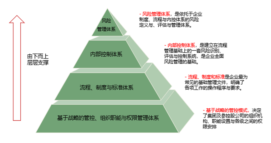 2、基于太阳成集团tyc122cc入口多年来开展管控、内控及风险管理的经验,建立企业全面风险管理体系应包含以下四个层次: