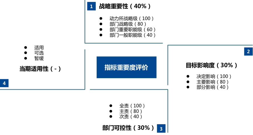 从战略重要性、目标影响度、部门可控性、当期适用性四个维度建立指标评价模型,由考核工作小组对各部门绩效指标进行初次评价,各部门负责人进行复评,选取评分排名靠前的指标作为当期部门绩效考核指标,最终由考核领导小组审核确认入选指标。入选指标每年由考核工作小组根据当年实际工作进行动态更新,如研究所战略或工作目标发生调整,则需重新进行指标评价。