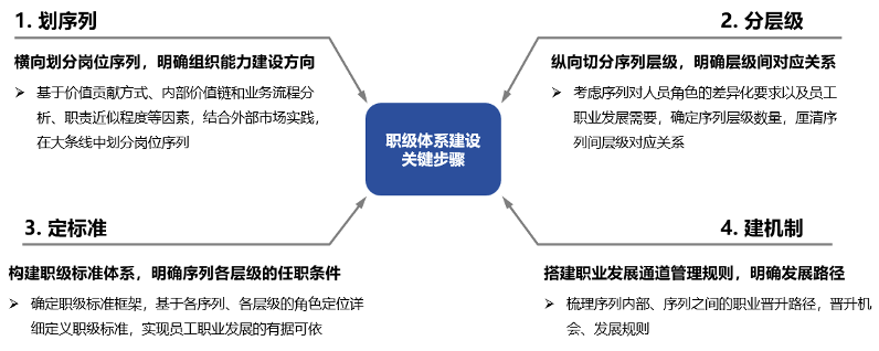 一个完整的职级体系建设项目,应主要包括“划序列-分层级-定标准-建机制”四个操作步骤。下面笔者拟从上述四个关键步骤入手,结合项目实践经验,对上述问题进行探讨。
