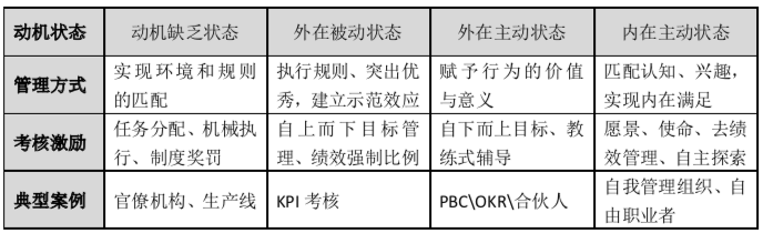 在企业层面,员工整体的动机状态,会与企业的行业特性、发展成熟度、管理风格、企业文化等因素相关,同时也具备时效性和个体差异性。合适的导向性管理下,员工行为动机可能从外在被动状态提升至外在主动状态,但不良的管理导向会使员工行为动机状态下滑。