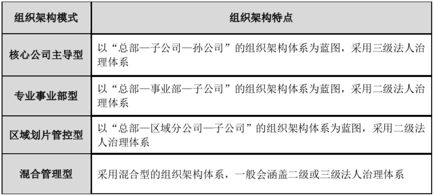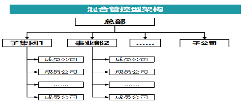 混合型管理架构下,集团针对不同的业务模块或业务区域形成了母子、总分等多种法人治理架构;同时由于不同的业务成熟度及专业化、一体化管控的需要,对不同的业务模块分别采取了母子孙、母事子、总分子等多种架构,集团管控架构总体上表现为混合式。