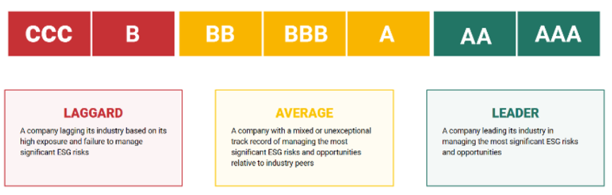 1、ESG至今并没有全球统一的定义和评级标准。各评级体系往往会基于GRI、SASB等的ESG披露标准,根据MSCI或申万等行业分类选取不同的指标并构建方法论,最终形成评价体系。以用的最多的MSCI为例,MSCI ESG评级模型指标体系主要由3大范畴(Pillars)、10项主题(Themes)、35个ESG关键议题(ESG Key Issues)和上百项指标组成。通过一系列企业自身披露的数据以及其它替代数据进行分析,最终确定企业评级。MSCI企业评级总共7级,最高为AAA,最低为CCC(如下图)。