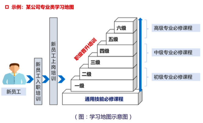 通过学习地图,员工可以清楚地看到从一名基层新员工至成为公司业务专家(专业序列)或者高层领导(管理序列)的学习发展路径。