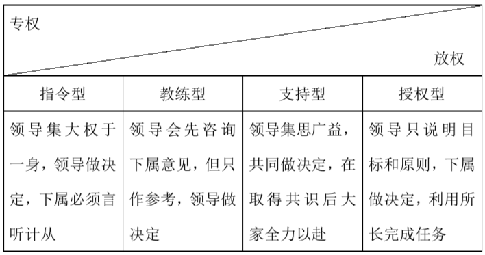 第四种为授权型领导,相信员工的能力,将工作任务交由员工全权负责、独立作业,仅在必要时提供适当的资源,将决策和解决问题的责任都托付给员工。当然有些工作是不能授权的,如人事任命、机密事务、决策事务、危机工作和上级领导让你亲自做的事情。