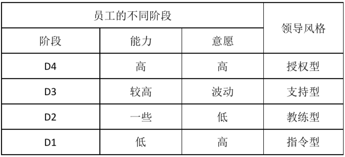 D4阶段一般是员工入职3年以上,工作能力强,能独立开展某项工作,而且工作意愿强,特别想独立开展工作。这个阶段适于采用授权型的领导风格,低指挥、低支持,充分授权给予发挥的空间。