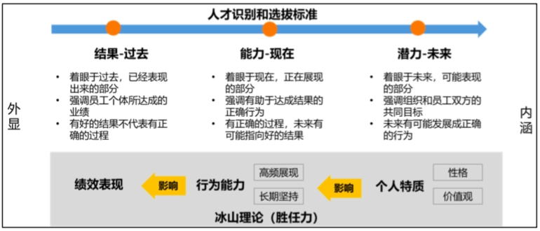 越来越多的企业,不再仅仅依据过去的表现-”绩效“这个单一维度来评估和选拔人才,而更加关注他们正在展现出来的、以及未来可能会表现的部分,对人才的评估更加全面。在人才盘点中,正是以发展的视角,从“绩效结果、能力、潜力”多个维度去识别和挖掘人才,分别对应着人才成长时间轴上的过去、现在、未来。
