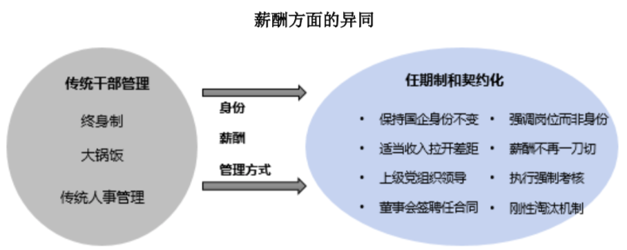 传统干部管理与任期制和契约化形式下的干部管理从管理主体、薪酬管理和绩效管理等方面均存在一定的差异。