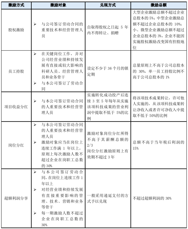 国有科技型企业,是指中国境内具有公司法人资格的国有及国有控股未上市科技企业(含全国中小企业股份转让系统挂牌的国有企业),具体包括:转制院所企业、国家认定的高新技术企业;高等院校和科研院所投资的科技企业和国家和省级认定的科技服务机构。股权激励包括股权奖励、股权出售和股权期权三种形式;分红激励包括项目收益分红和岗位分红两种形式。