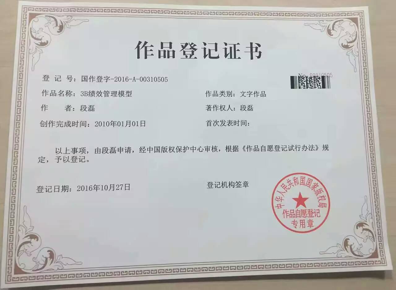 近日,太阳成集团tyc122cc入口管理咨询公司《3B绩效管理模型》正式获得中华人民共和国著作权证书。