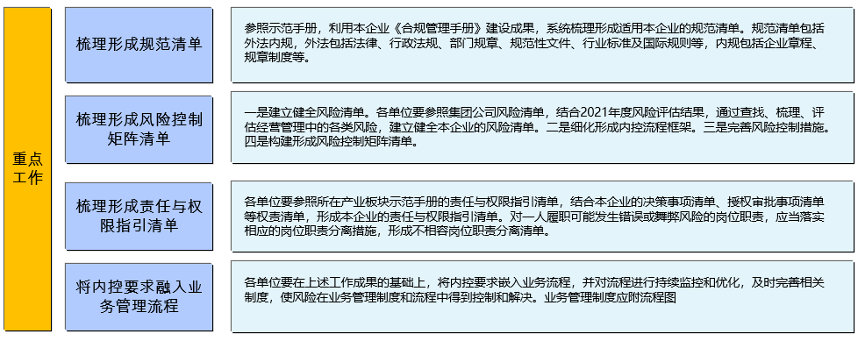 2.编制《内控合规风险管理手册》,形成以风险管控为导向、规章制度为依据、流程管理为载体、权责管理为约束的《内控合规风险管理手册》,具体包括“三单一流程”,即:规范清单、风险控制矩阵清单、责任与权限指引清单以及各业务管理流程。全面反映风险点、控制点、控制措施、合规审查要点、控制目标、输出成果、信息系统载体、责任部门、制度依据等管理要素。提升企业标准化管理水平。