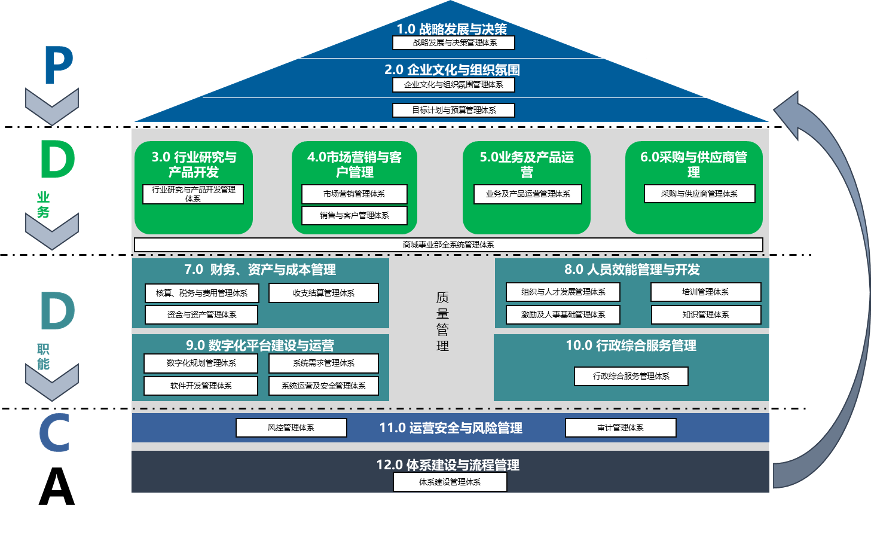 中小型企业的发展,可以靠着带头人的个人能力,或某项核心的技术,或是商业模式的创新。但是,一家大型企业要取得长足发展,除了依赖战略引领和发挥资本的力量外,还需要高效的管理体系、强大的组织能力与伟大的企业文化。通过管理体系建设能够实现业务及管理的规范化、标准化、系统化和数字化,能够带领企业从草莽走向秩序。