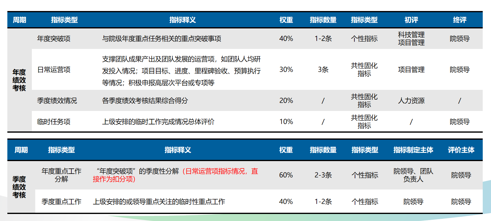 结合研究院业务特点,以项目全周期管理为基础,以员工与组织“共生、共创、共赢”为理念,打造以科技成果为前提的短、中、长项目全过程周期激励约束,推进核心人才职业发展与支撑产业命运共同体建设。