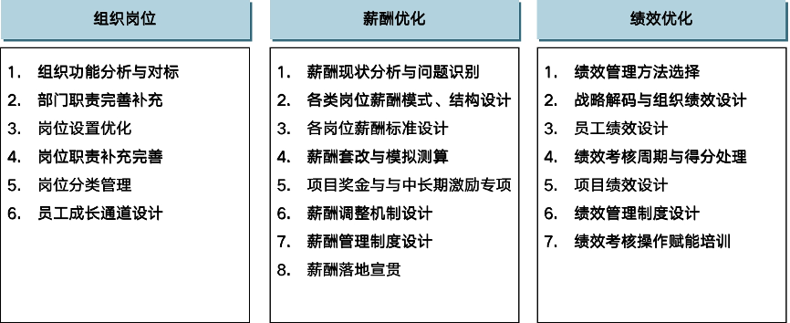 基于以上需求,本次咨询项目,应该从组织岗位、薪酬激励、绩效评价三个主线(如下图所示),开展系统性的管理方案设计,从深层次解决当前问题,达到预期改革效果。