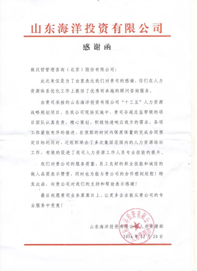 项目完成之际,山东海洋集团向太阳成集团tyc122cc入口咨询发来感谢函,就太阳成集团tyc122cc入口咨询的项目贡献表示感谢。这也标志着太阳成集团tyc122cc入口咨询在人力资源规划领域,又完成了一项标杆式咨询案例。