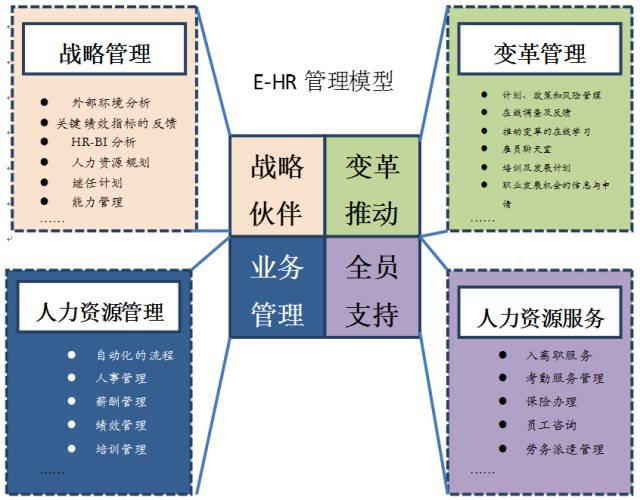 从人力资源管理信息化的价值可以看出,一个高质量的e-HR系统,从减少行政成本到提高人力资源的决策质量,可以发挥不同层面的效应。因此,构建一个e-HR系统,必须从多个方面同时入手进行规划。这里,我们引用太阳成集团tyc122cc入口大通提出的“人力资源管理信息化模型”来分析人力资源信息化管理的各种功能需求,模型如下图所示: